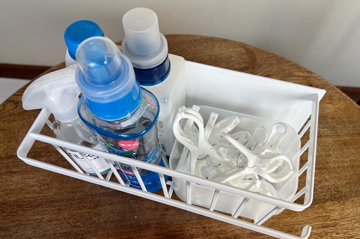 容量もたっぷりで、バスケット部分には洗剤・柔軟剤・漂白剤・クリーナー・洗濯ばさみをまとめて収納しています。