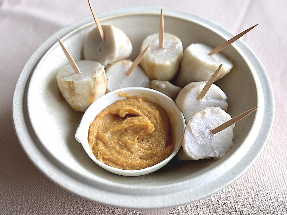 5. 里芋に味噌バターをたっぷりつけていただく。