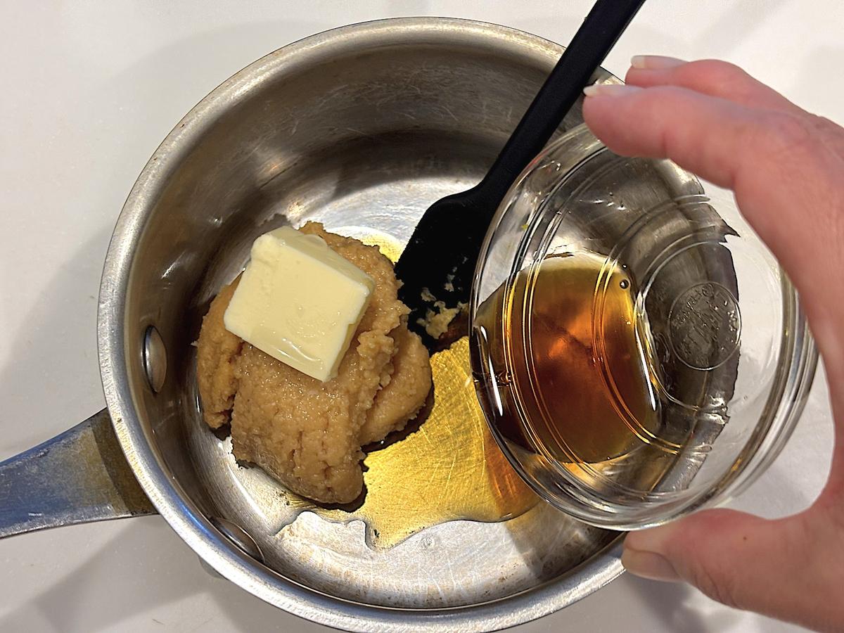 3. 小鍋に★以下の材料(白味噌、料理酒、しょうゆ、バター)を入れて火にかけ、焦がさないように全体を混ぜる。