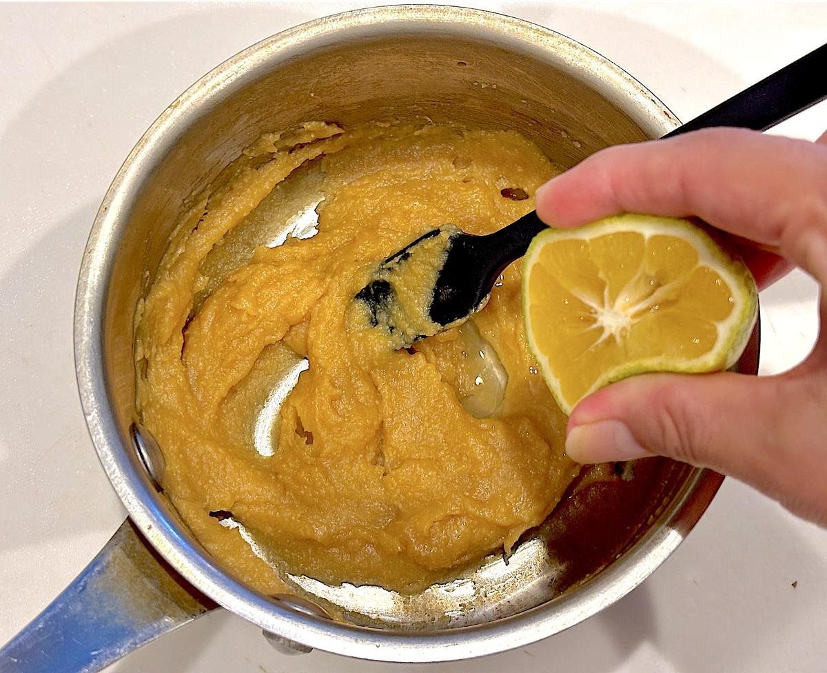 4. 3がなめらかになったら火をとめて、ゆずの果汁を加えて混ぜる。