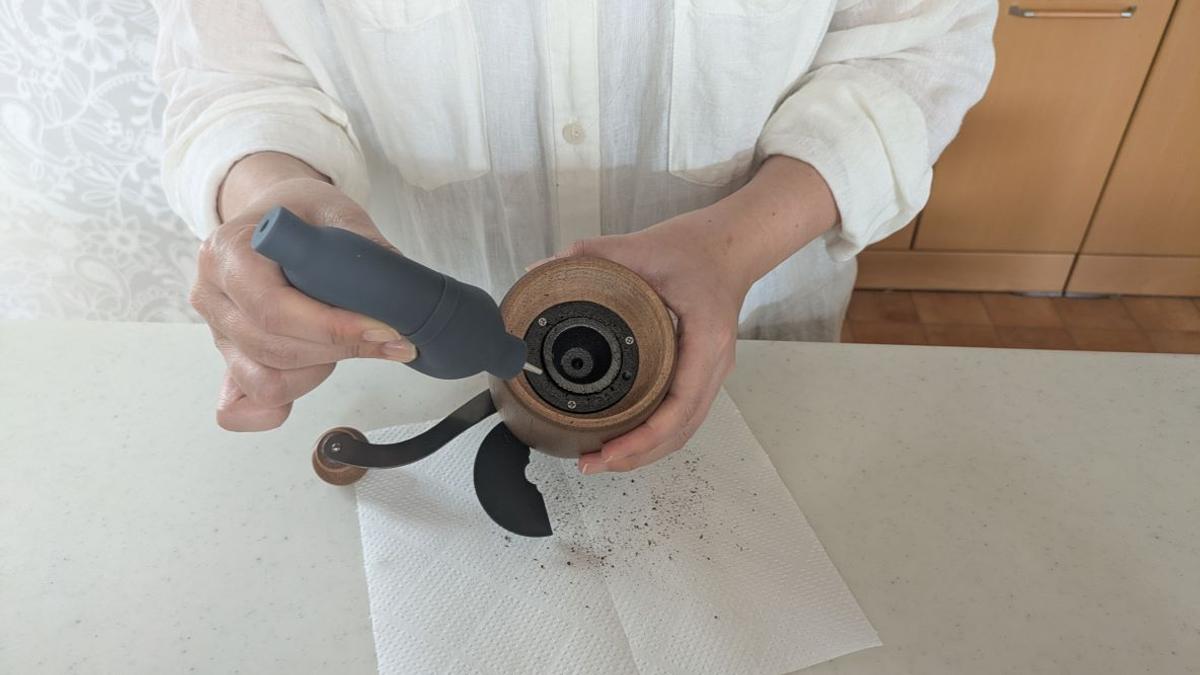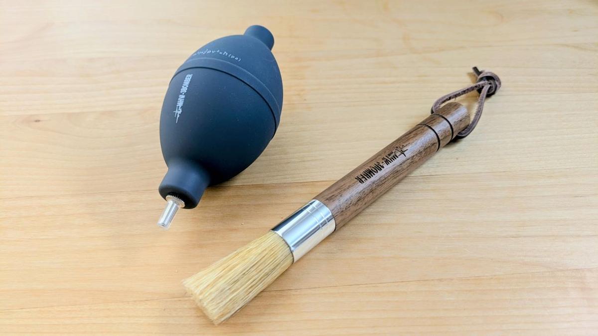 別で購入した、コーヒー用ブロワーとクリーニングブラシがミルの掃除にぴったり。
