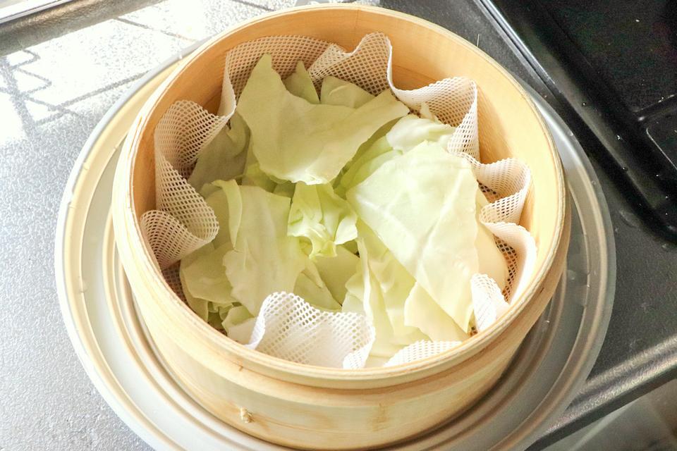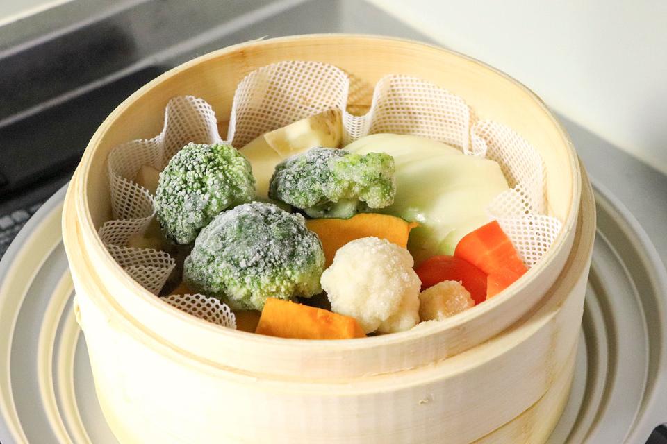 鍋にお湯を沸かしつつ、シリコーンシートを敷いた蒸篭に食材を入れます。あとは蓋をして、食材に火がとおるまで蒸すだけ。
