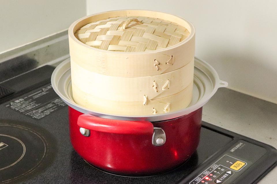 たっぷりのお湯を沸かした鍋の上に受け台をのせ、その上に蒸篭と蓋をセット。15分ほど中火で蒸すだけとシンプル。