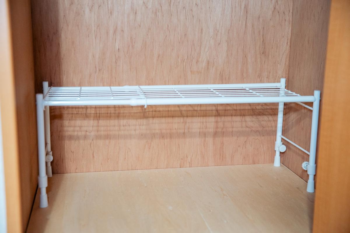 サイズは幅54~75cm、高さ29~41cm、奥行26cm。高さ・幅調整が効くタイプの収納棚になっています。