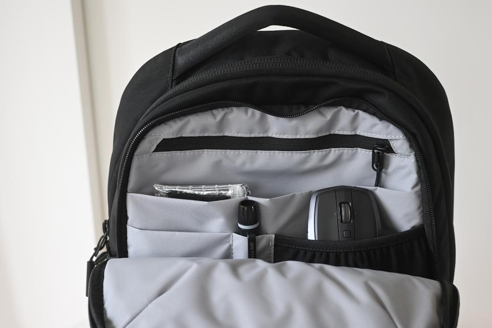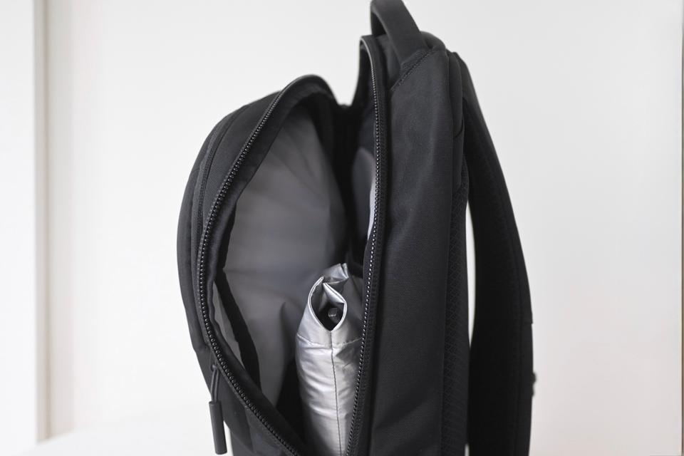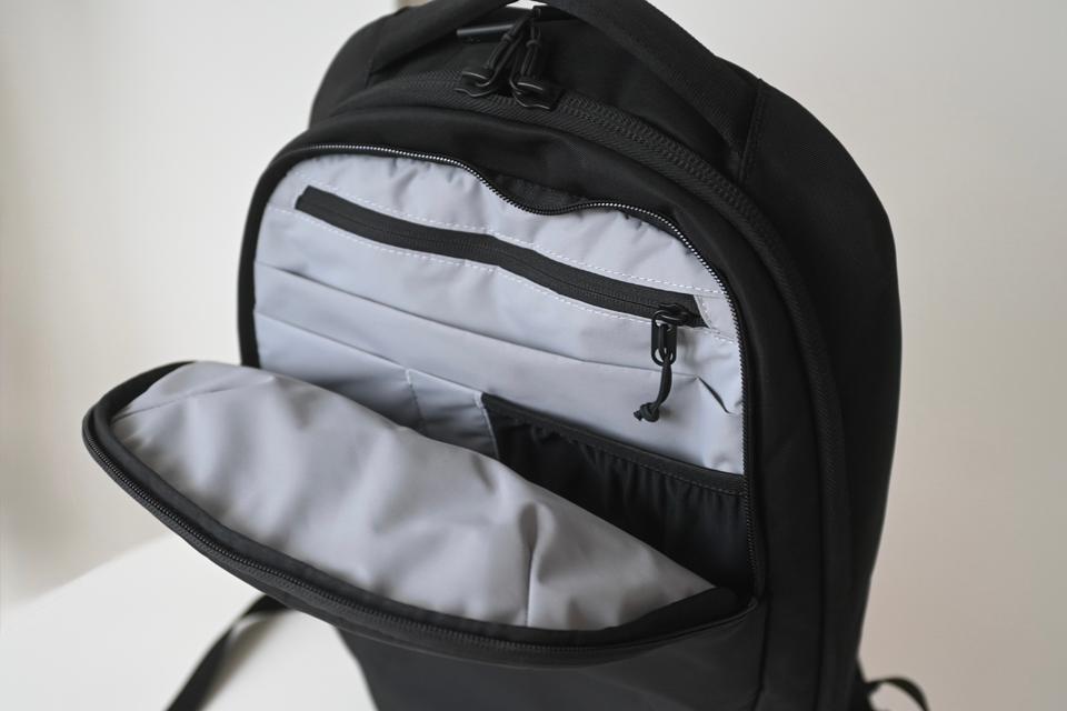 小さい容量でも、バックパックとして使いやすい機能が省かれていないのもポイント。メインポケットには16インチまで対応したPCスリーブを備え、A4書類もしっかり入ります。