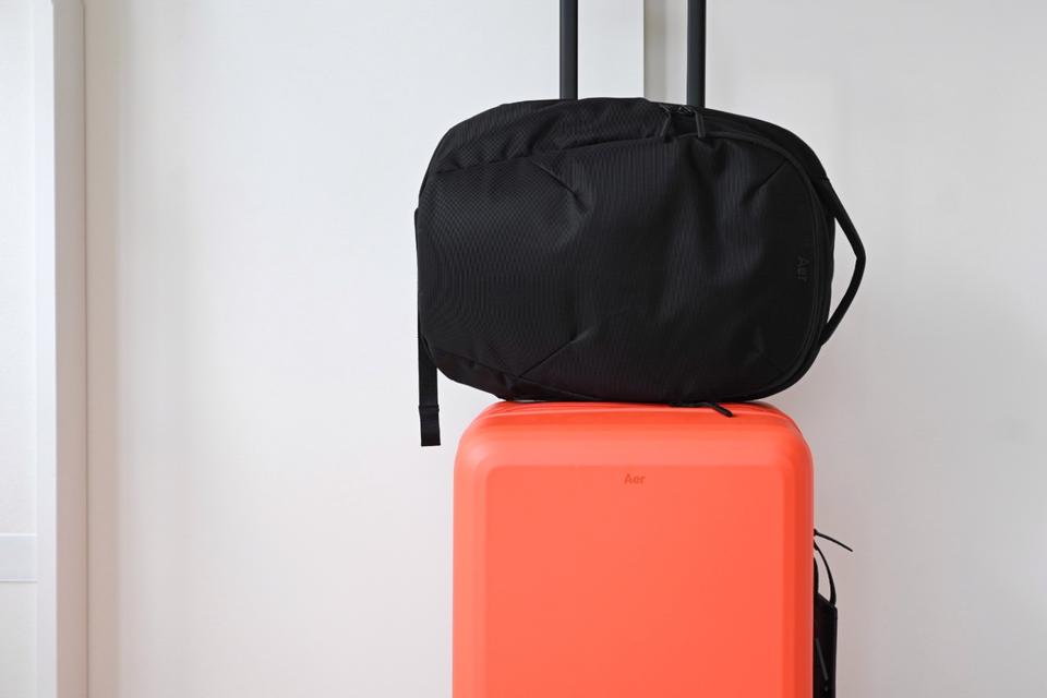 同じくAerのキャリーケースと組み合わせると、見た目もスマートでかっこいい。駅や空港などでキャリーと一緒に転がして運べるのも便利です。