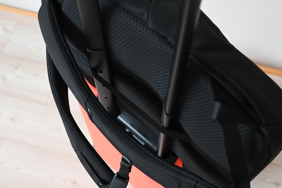 背面にはキャリーケースに通せるラゲージパススルーが付いているため、旅行にもぴったり。