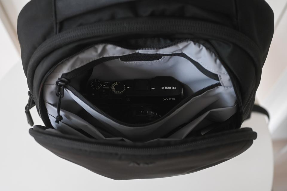 バックパックでなかなか活用しづらい上部のスペースを有効的に使えるので、12.5リットルという容量ながらも、イヤホンからカメラまでたっぷり入るのが魅力。