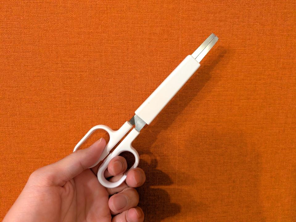 持ち手に近い刃元の方は、いわゆる「はさみ」の構造になっているので、その部分で挟んでチョキチョキ切ることができるんです。