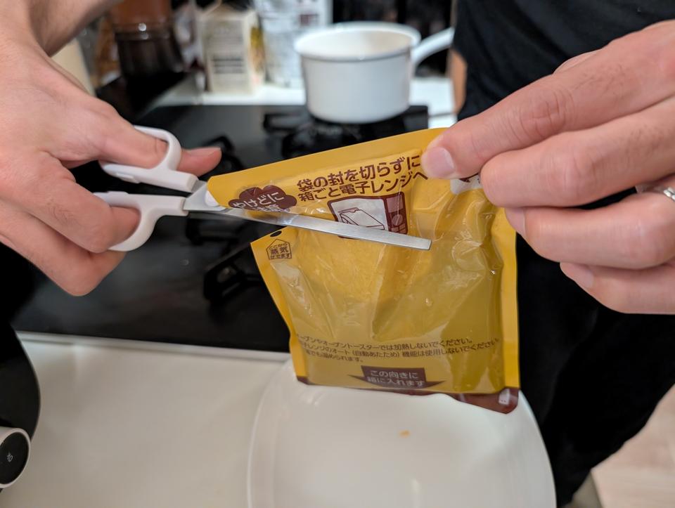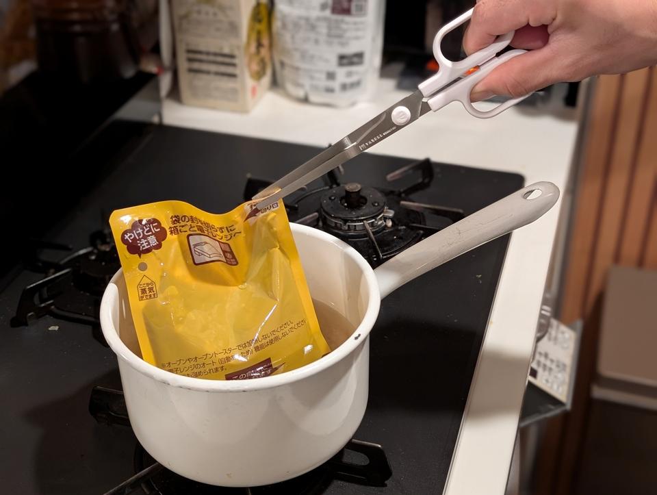 大体のパウチには最初から手で切れるよう切り込みが入っていますが、湯煎後は触れられないほど熱いので、私は一度水で冷やす作業をはさんでいました。
