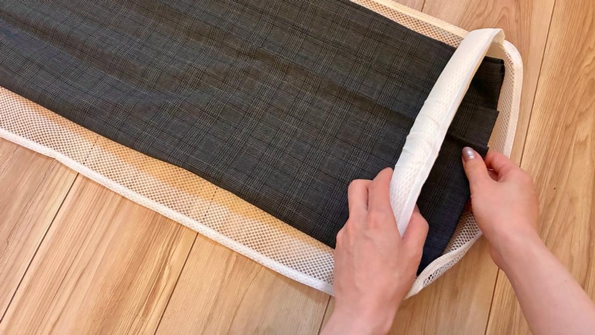 くるくると巻いていくことで、丈の長い衣類もプリーツを崩さずにネットにイン。
