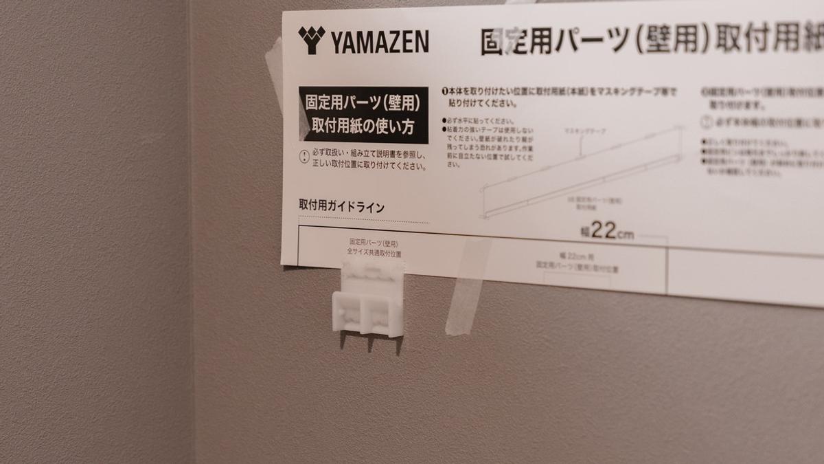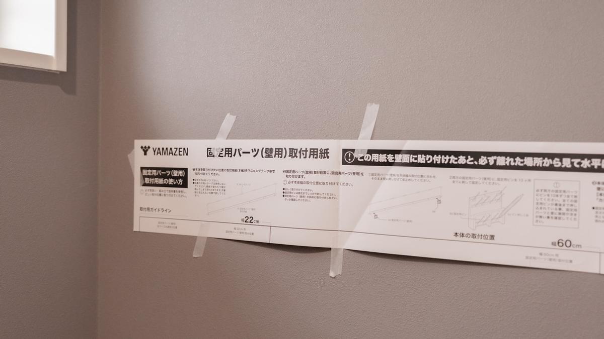 取付位置を決めたら、付属のガイド用紙を壁に貼り付けます。この時に、水平器があると便利でした。