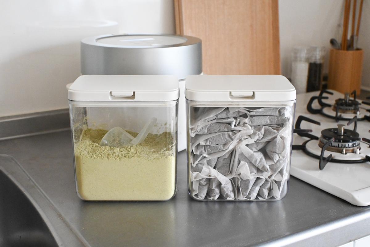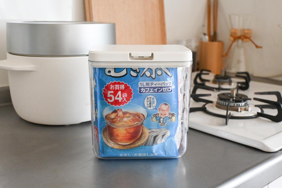 なんとこの保存容器、小麦粉や麦茶パックなどの食品を袋ごと入れられるんです。