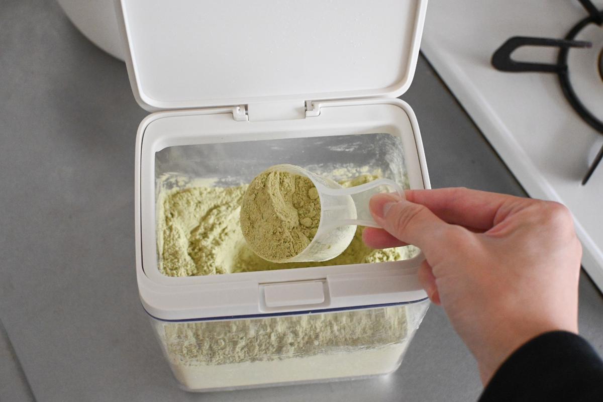 特に付属のスプーンが大きめですくいにくいプロテインもこぼさずすくえるので、保存容器やキッチンが汚れないのがありがたいです。