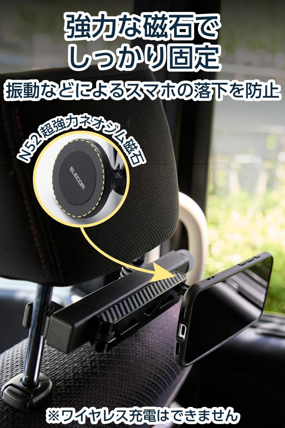 ELECOM(エレコム)の「MAGKEEP 車載スマホホルダー 後部座席タイプ P-CARS17BK」を取り付ければ、スマホを手持ちすることなく快適時間を過ごせます。