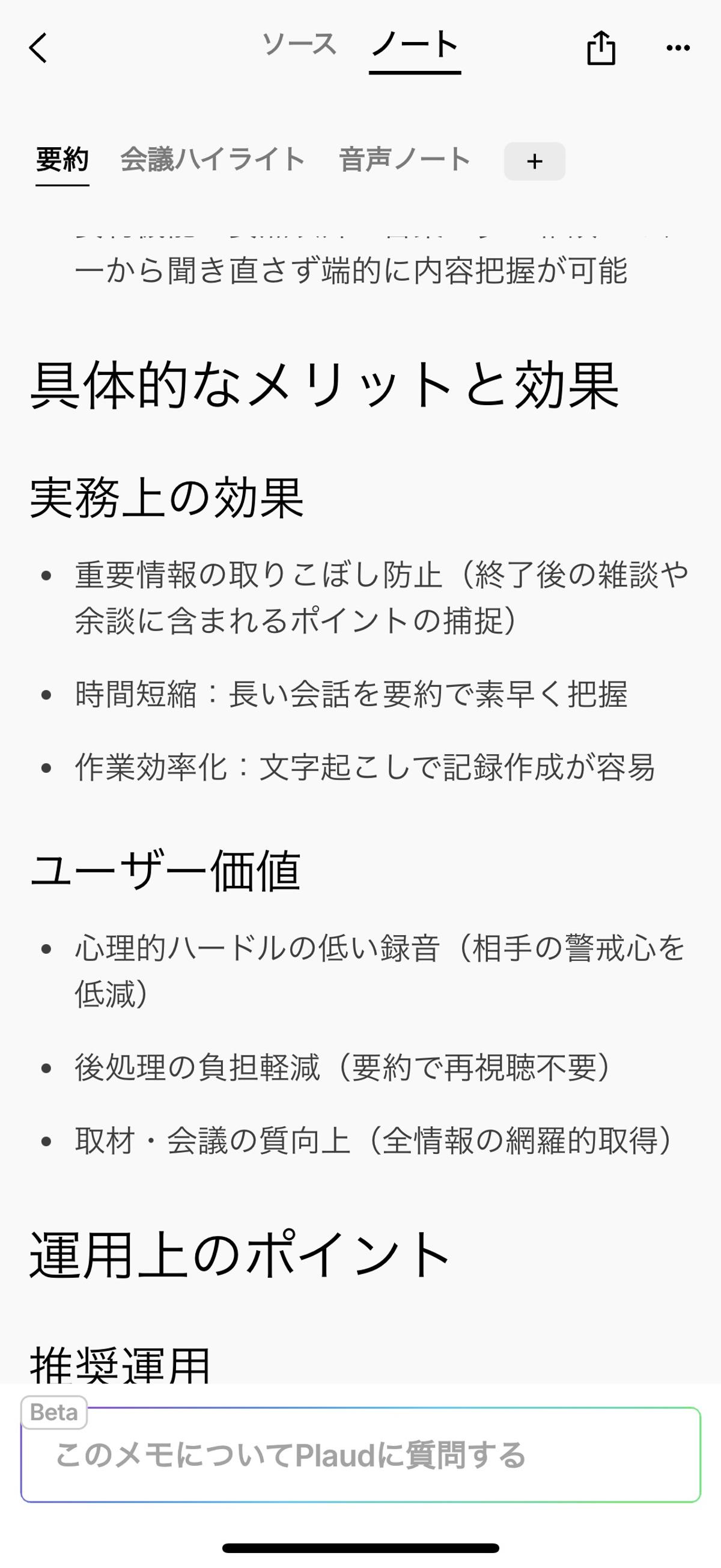 試しに、このPlaud Notepinの魅力についてカンタンにしゃべってみた音声を、Plaud Notepinに文字起こししてもらいました。