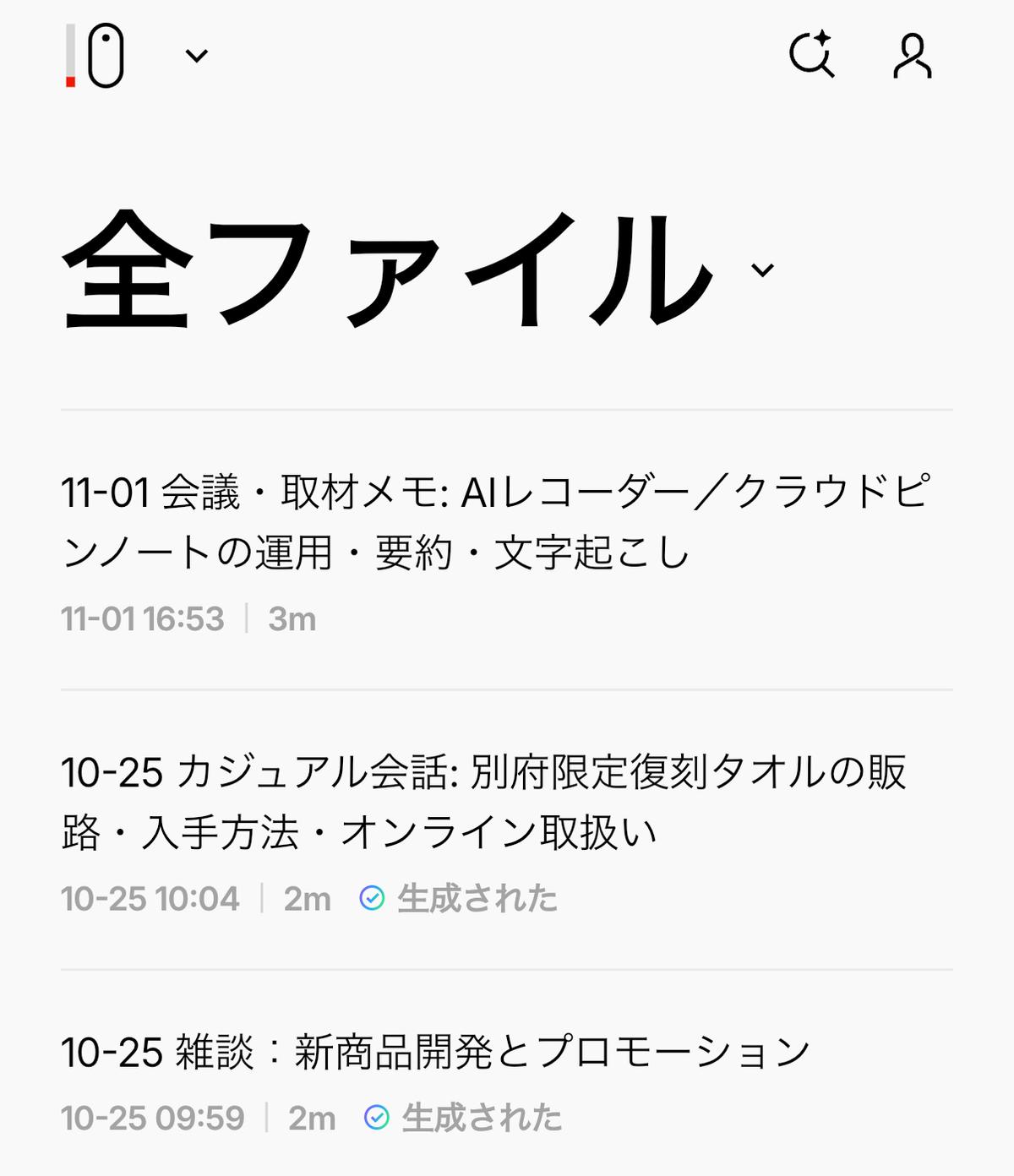 スマホ上ですぐに音源を数秒程度再生し、どの音声をAIに文字起こししてもらうかカンタンに選択できます。そこからはタップ1回で自動生成スタート。さらにAIが、内容を端的にまとめたタイトルを各音声データにつけてくれるので、「これなんの音源だっけ?」と迷子になることもありません。