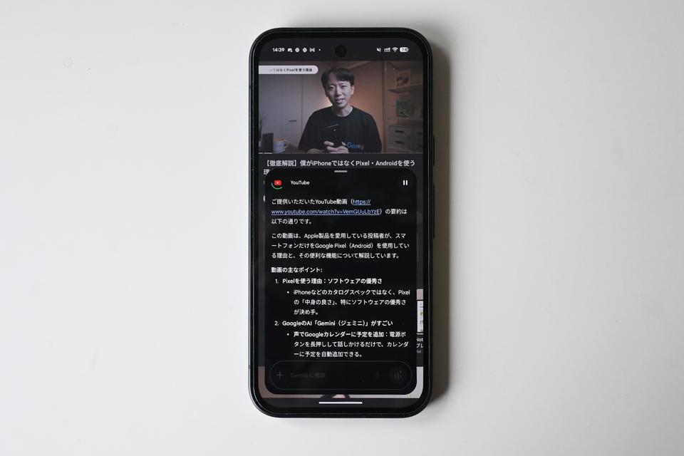 通常であれば、動画のURLをコピーし、Geminiを開いて打ち込む必要がありますが、PixelならYouTubeから離れずその場でできるのが便利。仕事で情報をたくさん集めたいときなどにも助かります。