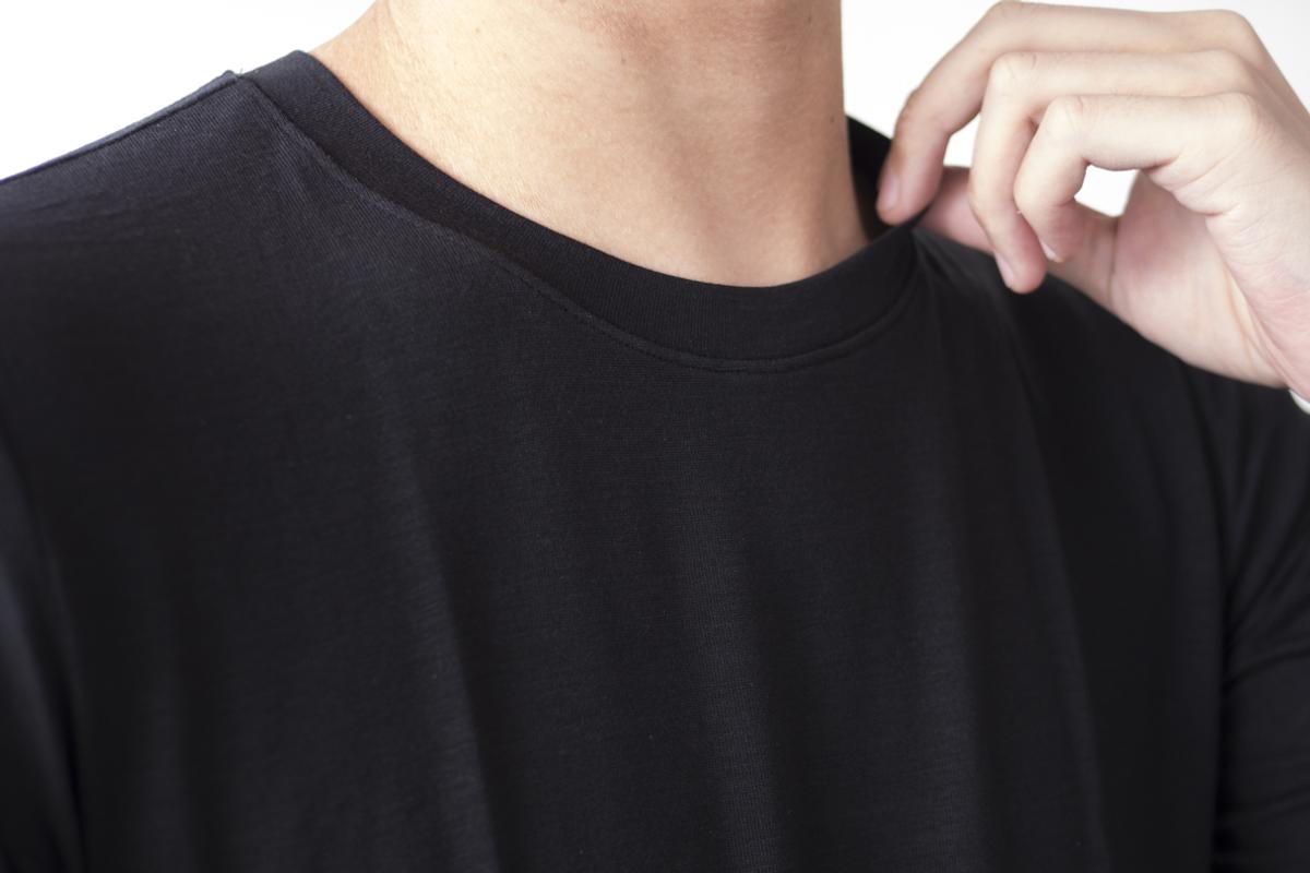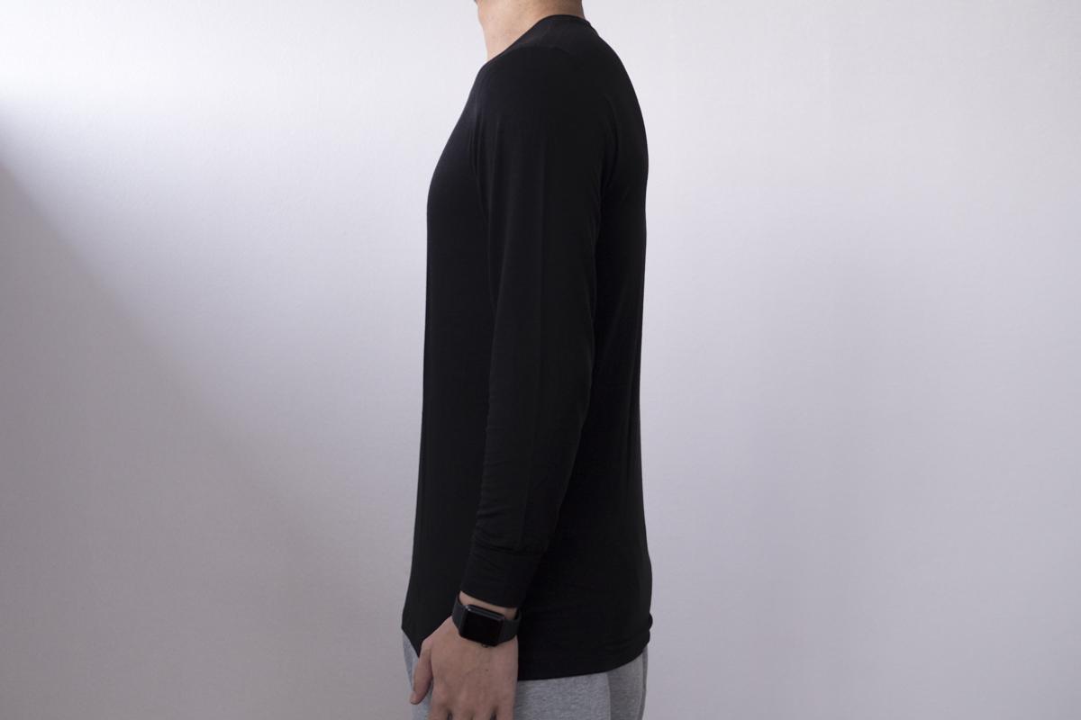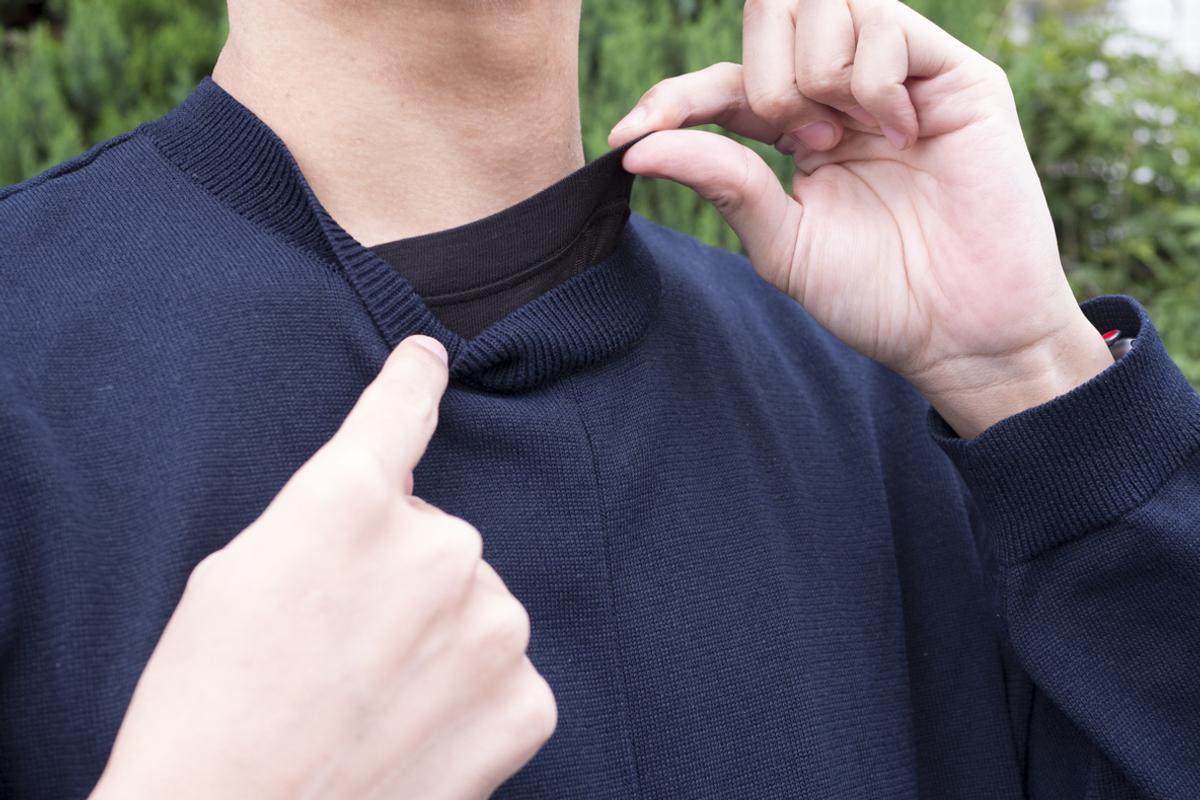首回りは広すぎず、ですが詰まっているというわけでもないので、上にスウェットやセーターを着た時にも見えにくくなっています。