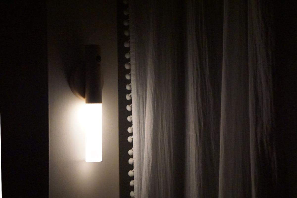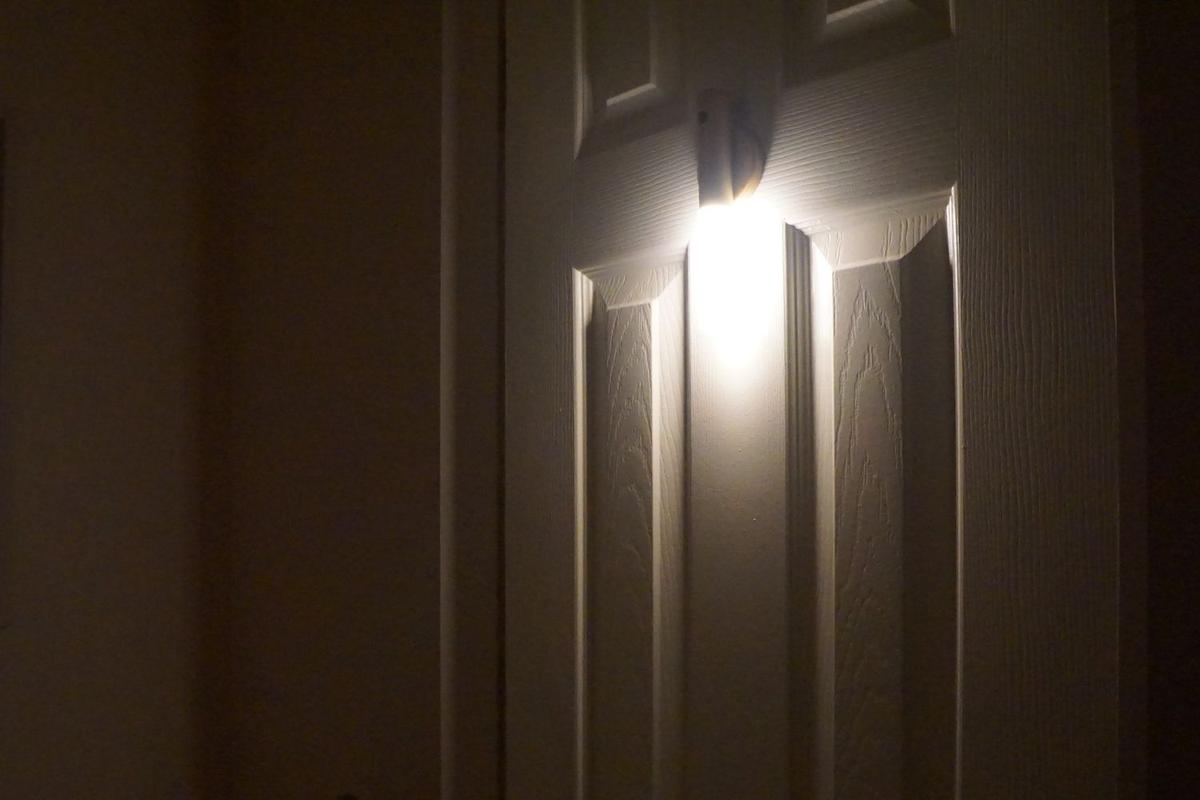 早速、お手洗いまでの動線にあるドアに「スマートセンサーライト」を設置してみました。明るさと灯りの広がり方は、手元足元がしっかり見える程度で、よい塩梅!