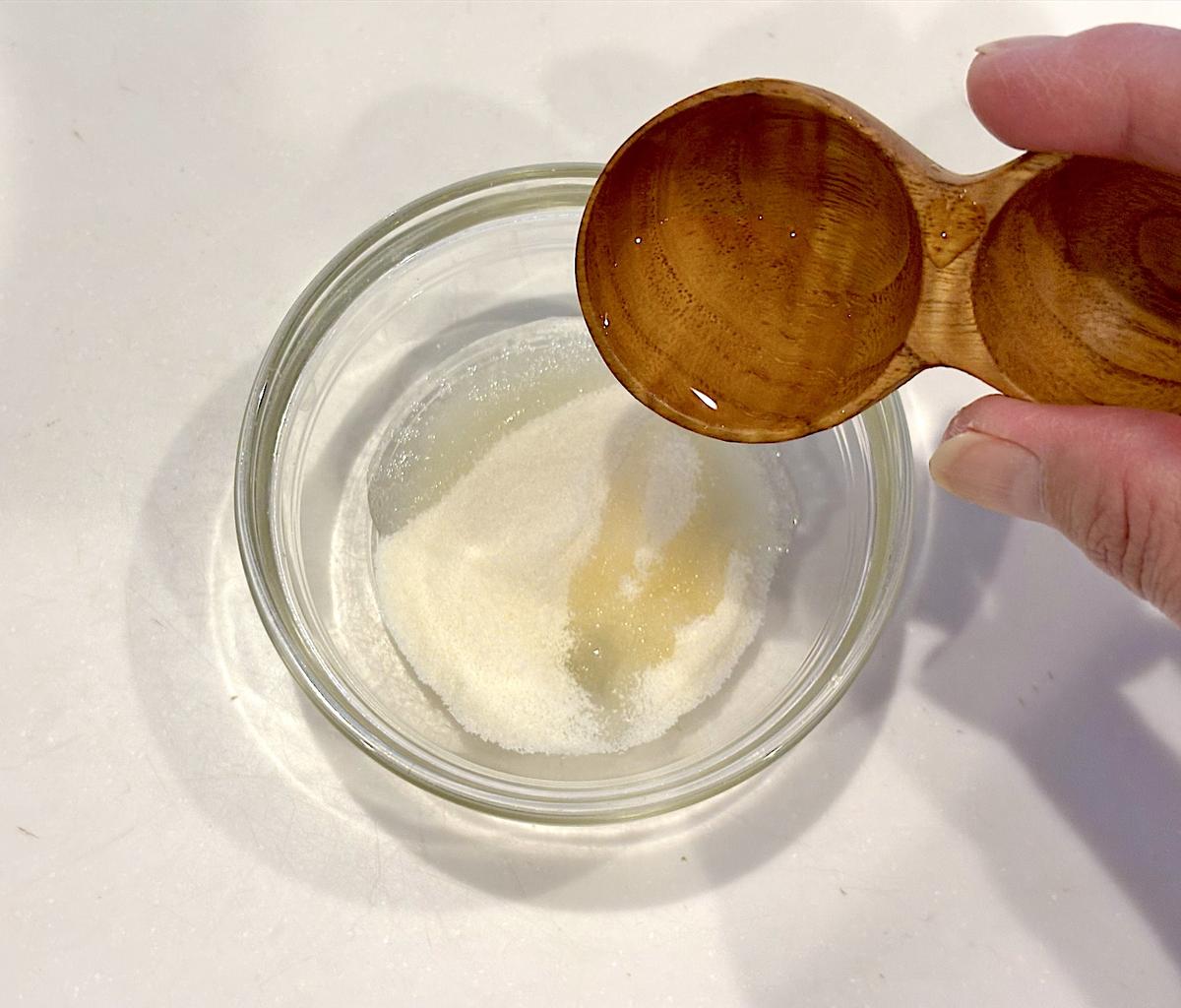 1. 粉ゼラチンはプリンカップなどの器に入れ、大さじ1杯の水(分量外)でふやかしておく。