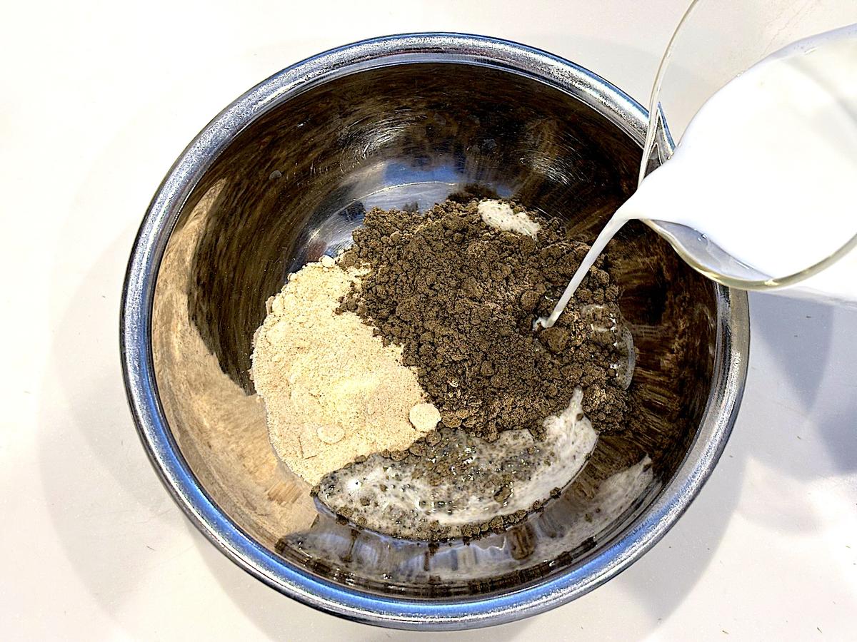 2. ボウルに黒ごま、砂糖、牛乳を入れて泡立て器で混ぜる。