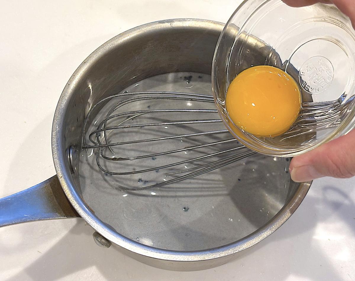3. 2の半量を小鍋に移し、卵黄を加えて混ぜて火にかける。