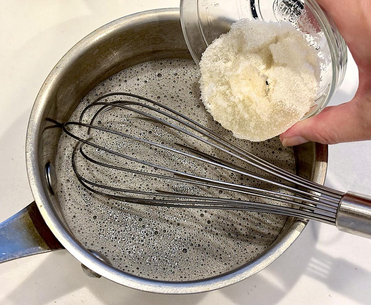 4. 湯気が出てくるくらいにあたたまったら(沸騰させないこと)、火からおろし、1の粉ゼラチンを加えて混ぜ溶かす。