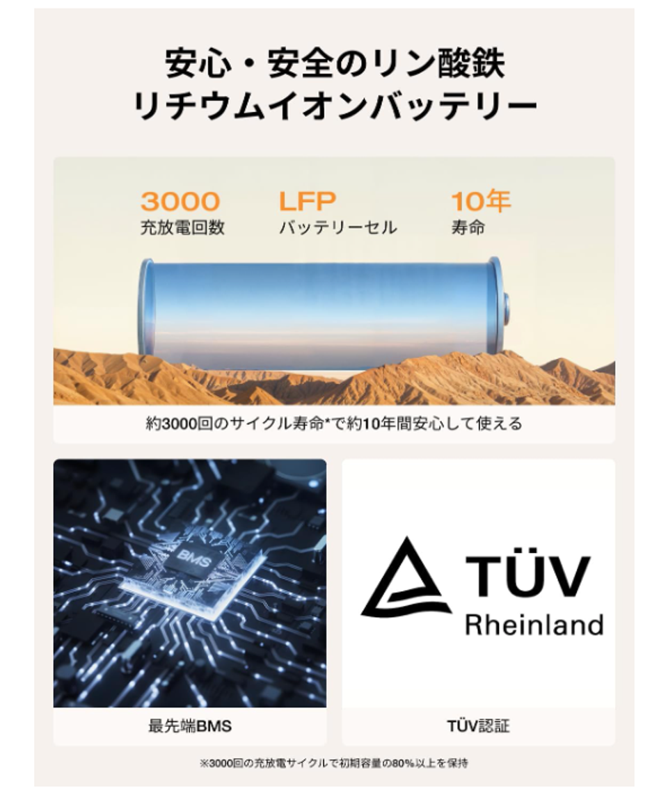 耐熱性・安全性に優れ、ポータブル電源業界では初となるTÜV Rheinland(テュフ·ラインランド)の認定を取得済み。