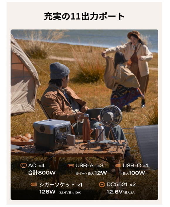 ACx4、USB-Ax3、USB-Cx1、DC5521ポートx2、シガーソケットx1の合計11個の出力ポートが搭載されており、キャンプ・防災・非常用電源としても活躍します。