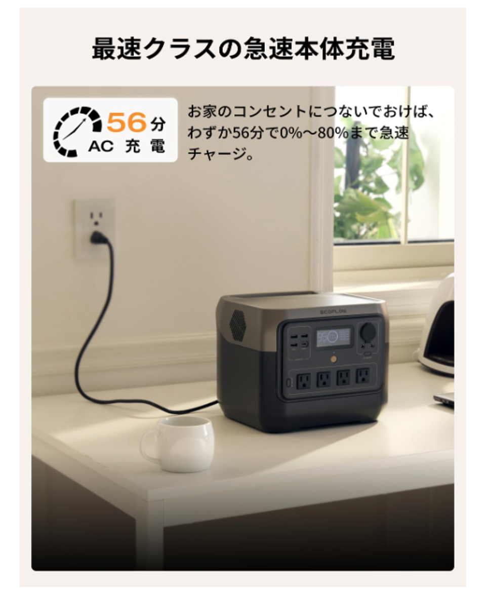 EcoFlowのポータブル電源「RIVER 2 Pro」は、特許取得済みの「X-Stream充電テクノロジー」が採用されており、わずか70分でフル充電が可能です。