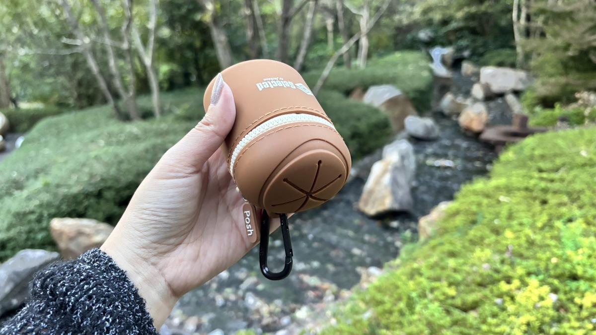 カラビナが付いているのでバッグに取り付けやすいし、約63gと軽量なので持ち歩きも苦になりません。アウトドア感が強すぎないナチュラルなデザインもいい感じ!