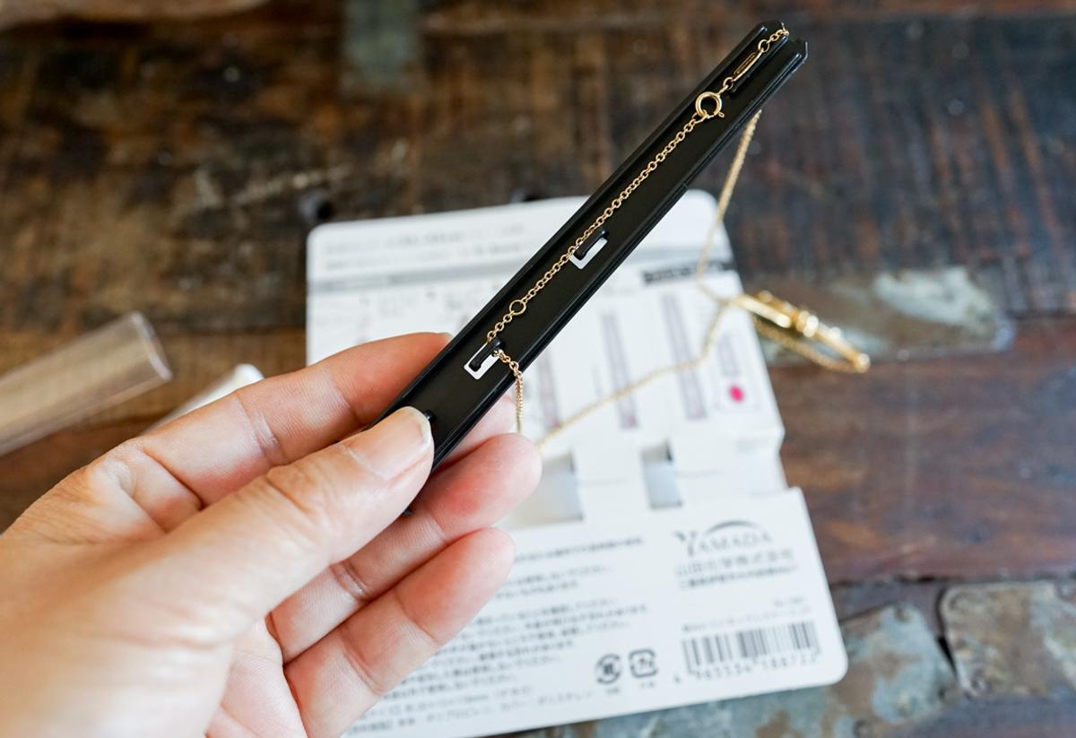 大き目のペンダントトップがついているものでもケースから出して収納でき、チェーンの長さは35~45センチ、0.8ミリの太さのものまで対応可能。