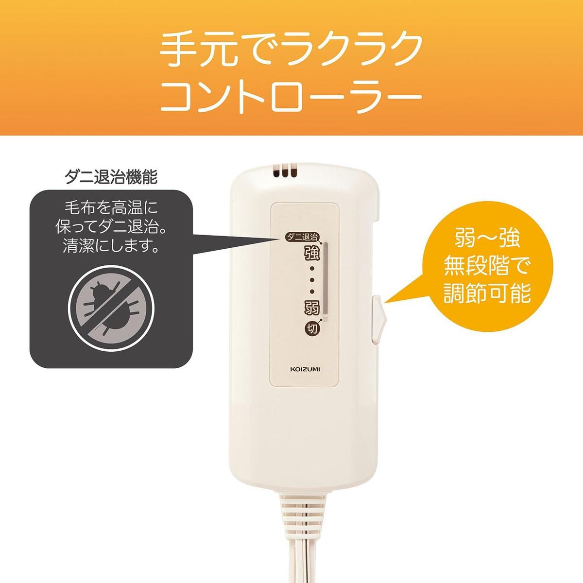 衛生面では、毛布部分を洗濯機で丸洗い可能(※コントローラーは取り外し必須)。日常的に使う寝具だからこそ、いつでも清潔に保てる点は大きなメリットです。清潔維持に欠かせないダニ退治機能も搭載。「強」設定で約3時間通電することで毛布内部を高温に保ち、寝具ケアの手間をしっかりサポートします。