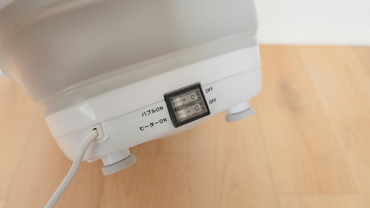 スイッチは本体外のかかと側にあるので、足を浸けているときはボタンが見えず押しにくいのが少し残念ですが、慣れれば問題なく使えました。