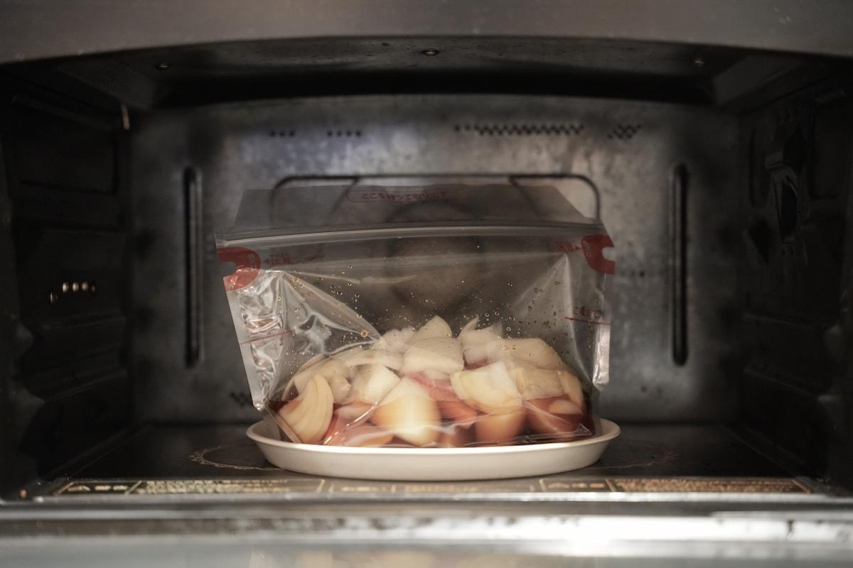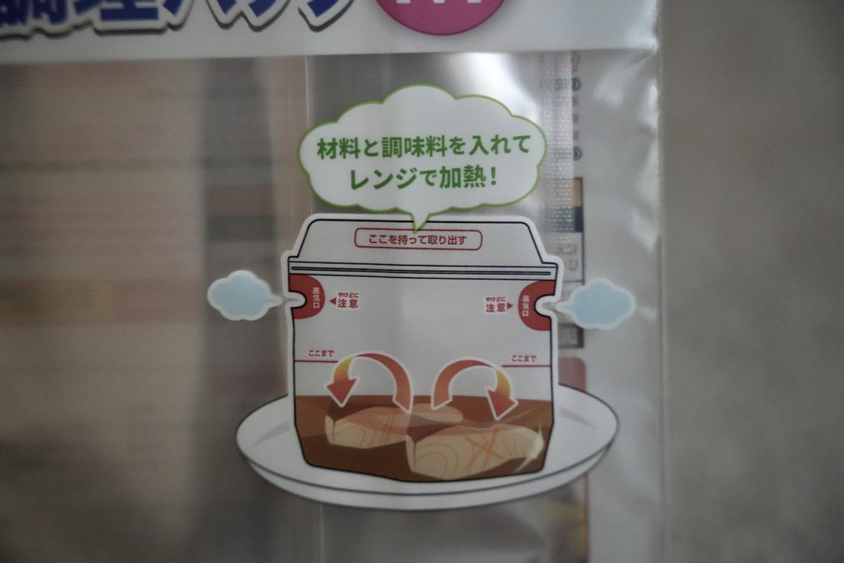 この袋に、具材と調味料を入れて、電子レンジで加熱するだけで料理ができ上がるんです!