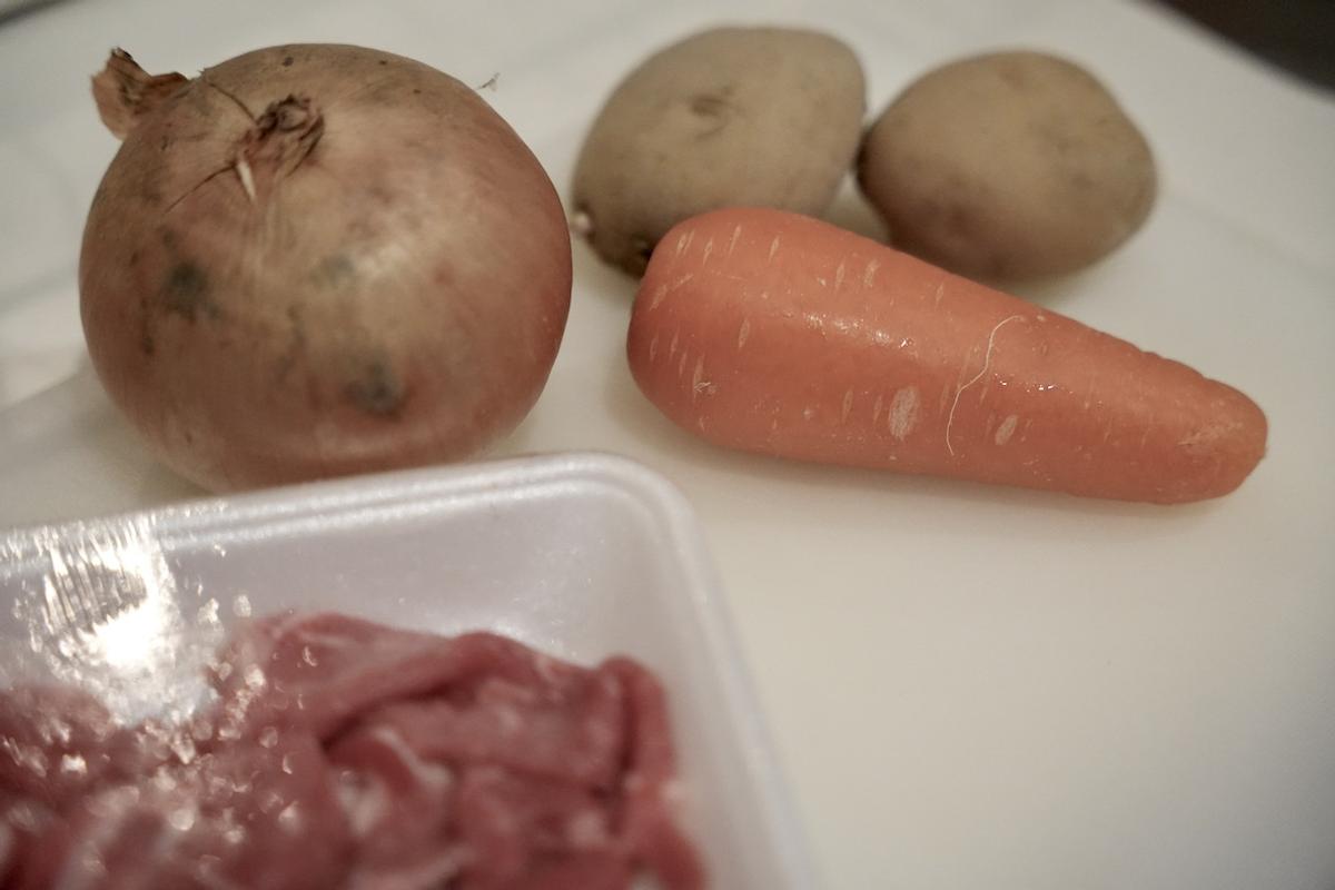 次に、ジャガイモとにんじん、牛こま切れ肉、玉ねぎを切って、先ほどの袋の中にイン!