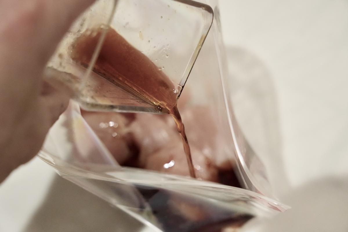 まず、袋の中に直接、砂糖とめんつゆ、水を入れて混ぜ合わせます。
