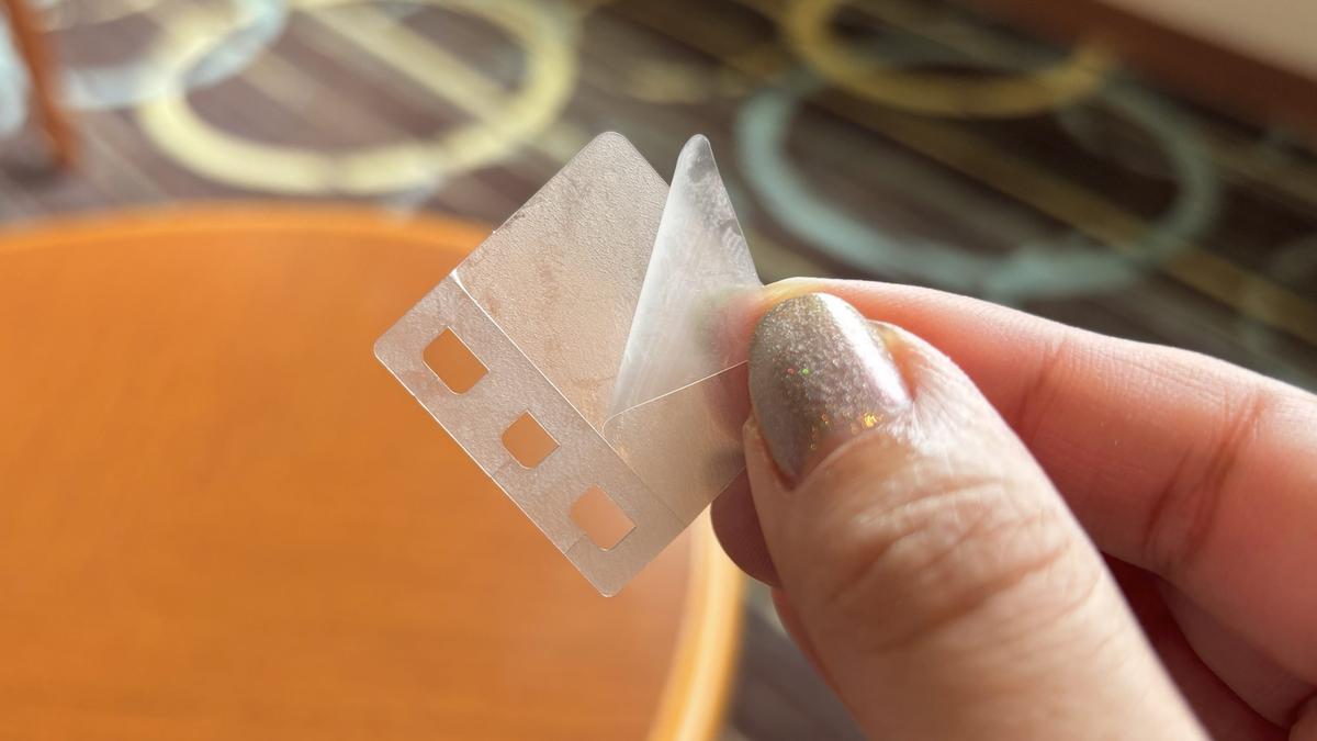 シンプルな使い心地もいい感じ。粘着面を名刺やカード、チケットなどの端にペタッと貼り付けるだけです。