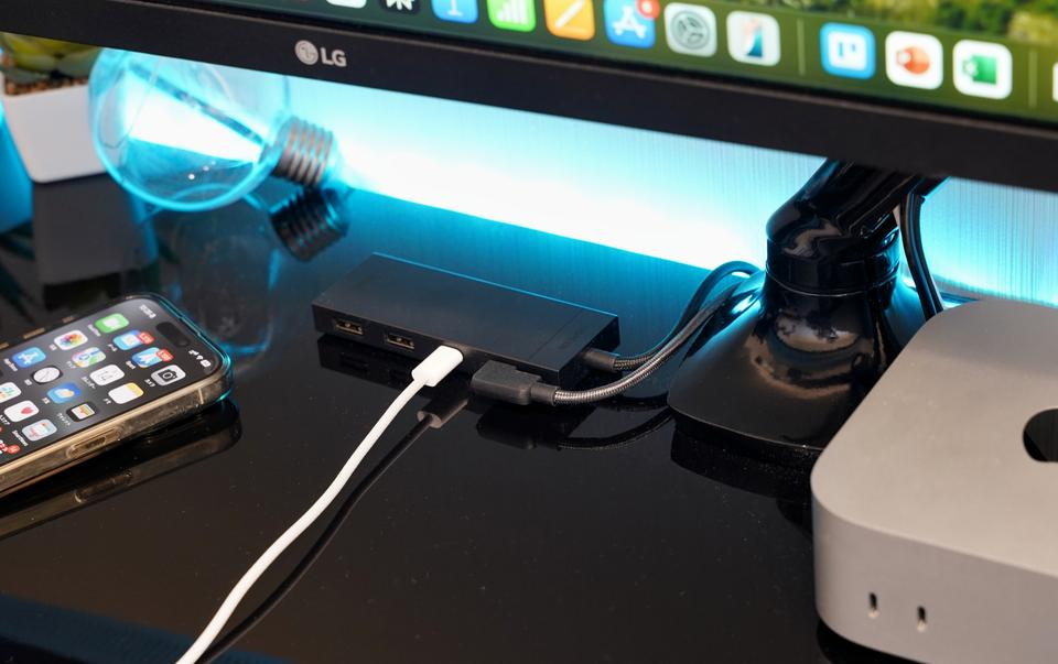 そしてこのケーブルを褒めたいところは、片方のコネクタが「L字」という点。ハブから配線を這わせるときも、PCに充電するときも、横向き方向に線を出せるので見た目がスッキリ。視覚的なノイズになりにくく、ケーブルワークしやすいのがとにかく気に入りました。