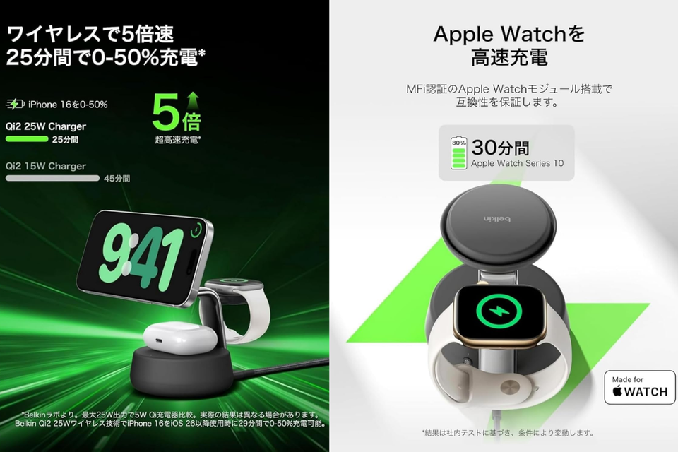 従来のワイヤレス充電機では、15W出力が一般的でしたが、「Belkin Qi2 25W ワイヤレス充電器 3 in 1」は、Qi2 25W出力で高速充電を実現。