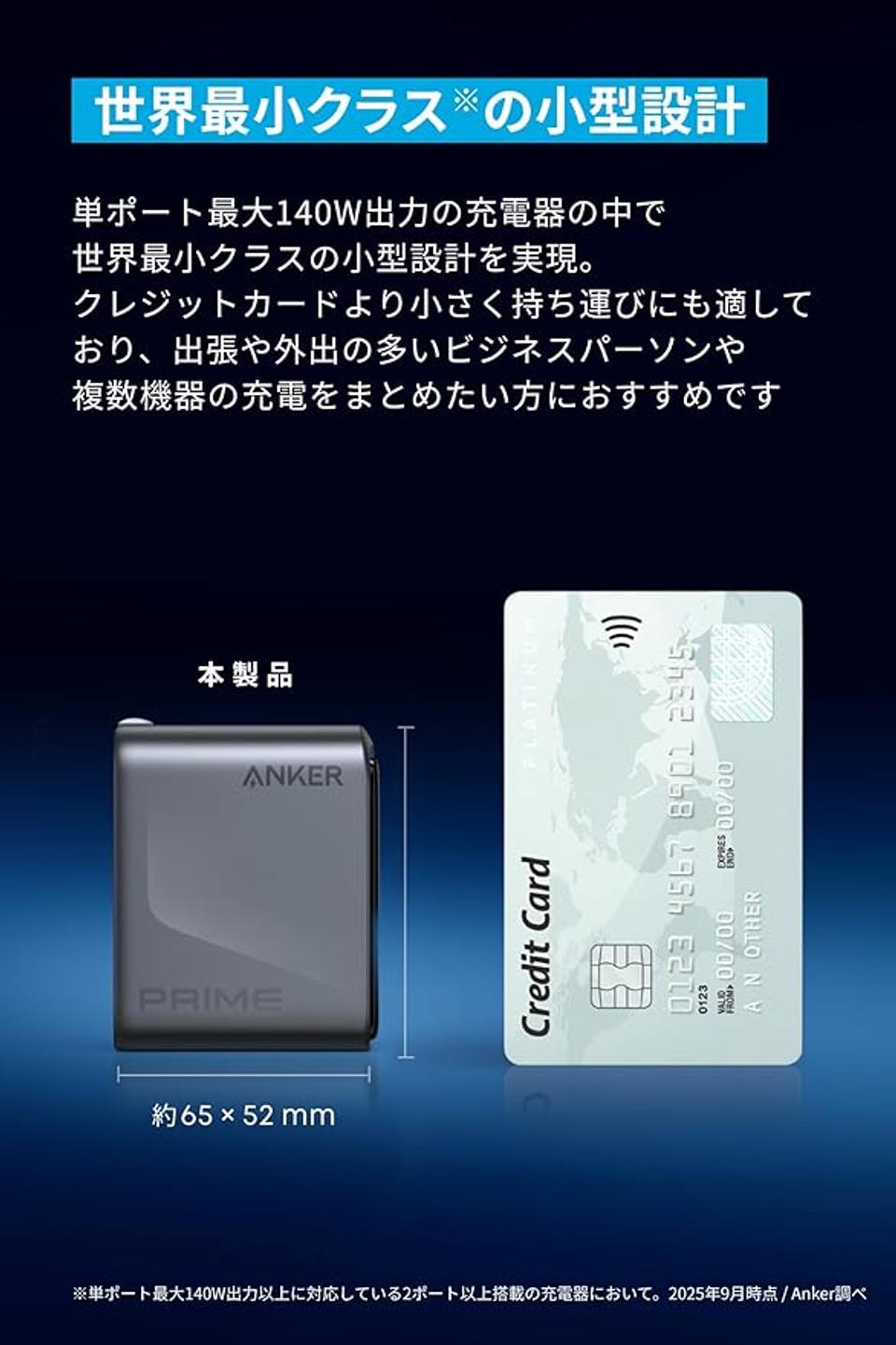 持ち運び用の充電環境を一気に軽くしてくれるのが「Anker Prime Charger(160W, 3 Ports)」。単ポート最大140Wのパワーを備えながら、世界最小クラスのサイズを実現したモデルです。