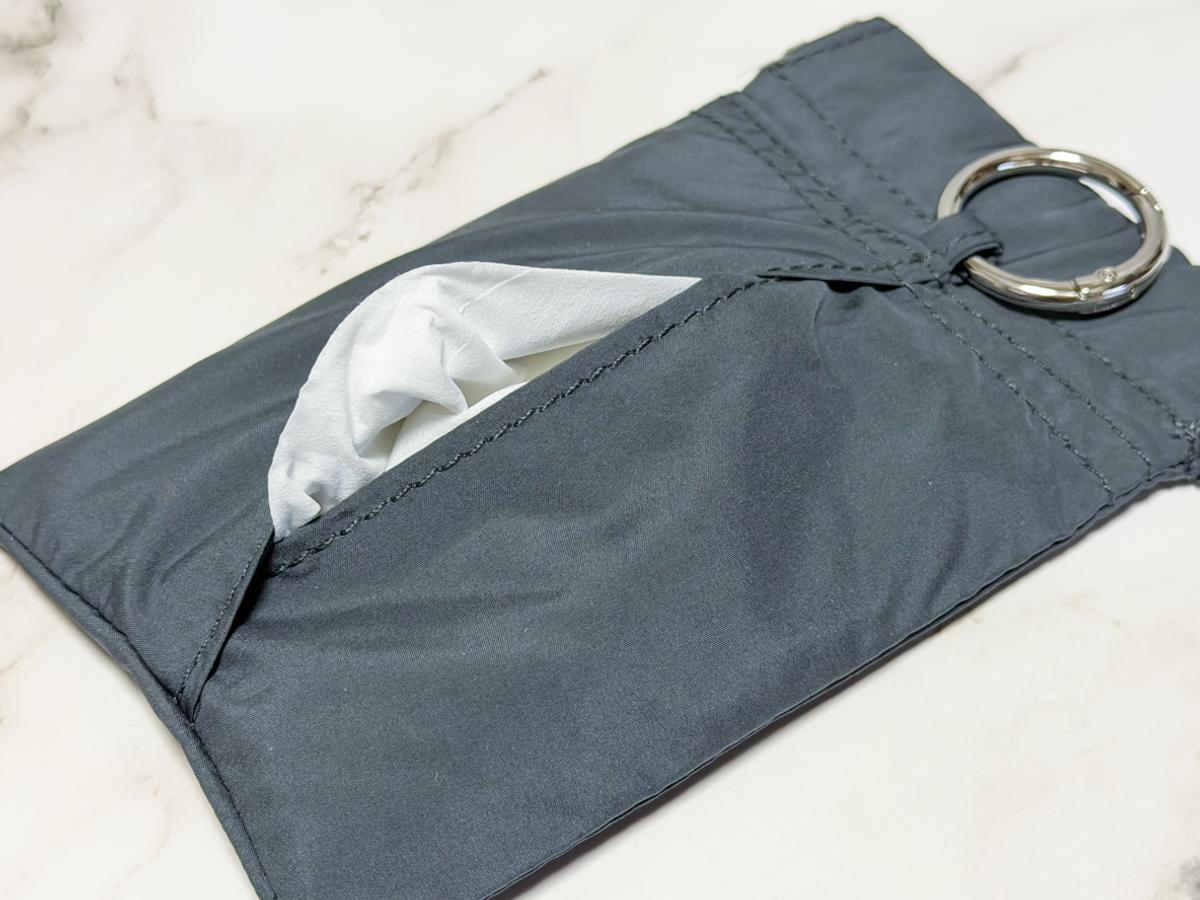 片面にポケットティッシュが入るポケットが付いているのも、ならではのポイント。