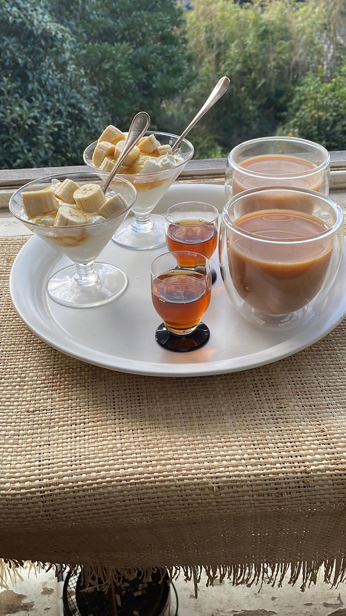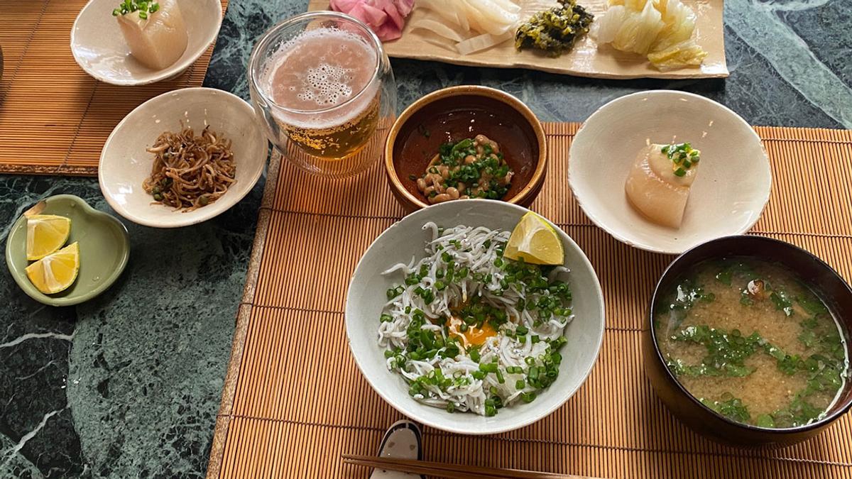 釜揚げしらす丼(卵黄)、納豆、ちりめん山椒、なめこの味噌汁、京都の漬物。