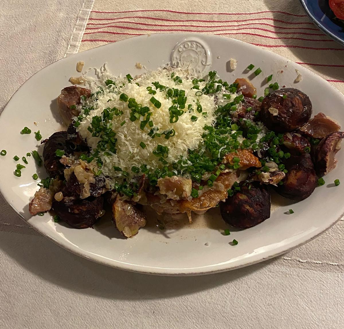 カリカリに焼いた鶏肉と栗を、各20gの(バター、生クリーム、水)を混ぜ合わせたソースに絡め、最後に20gの粉チーズをたっぷり。Regalo小倉さんのレシピを少しアレンジ。このソースとチーズの組み合わせは、ともかく美味しい! そして簡単!
