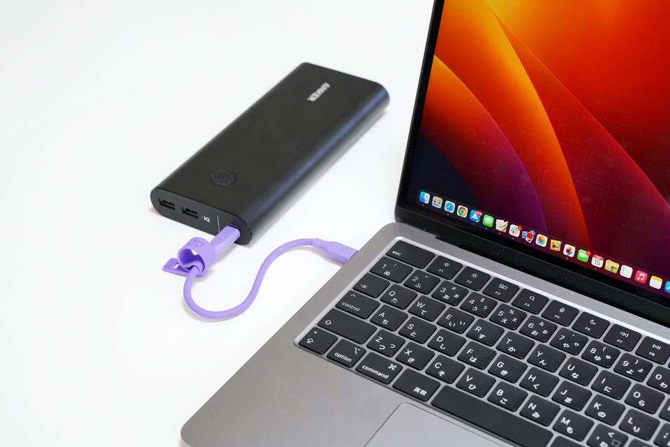 電源席に縛られるのが嫌なので、モバイルバッテリーに繋ぎつつPCワークをすることもあるのですが、超ショートケーブルではテーブルの上にケーブルがのたうち回る気持ち悪さがありません。コンパクトに完結するおかげで、視覚的なノイズが減るのです。