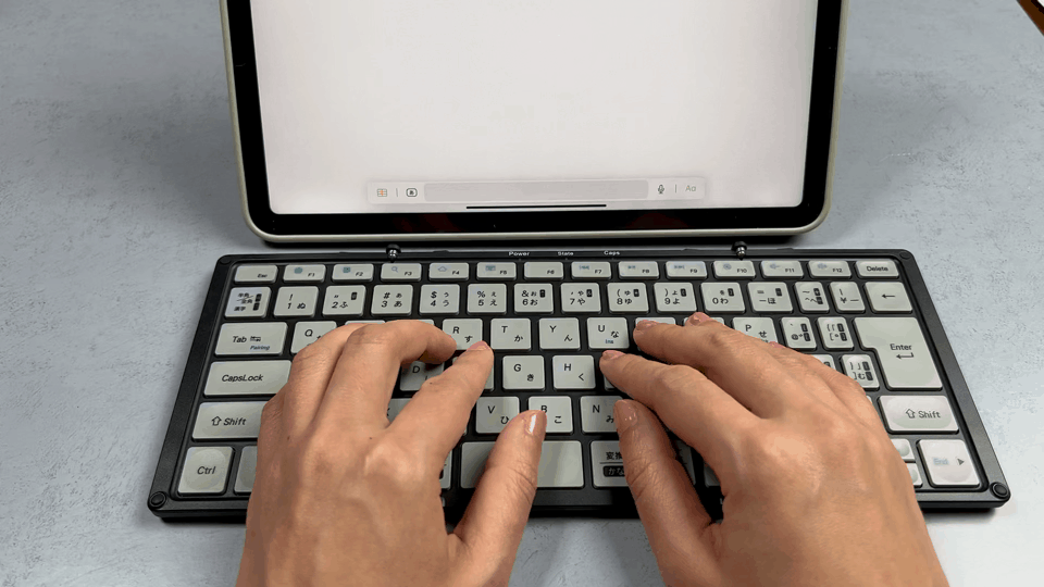 表面に継ぎ目の出ない構造で、キーピッチも19mmと広め。携帯キーボードにありがちな「キーピッチに合わせて手をすぼめて打つ」必要はなく、普段使っているPCのキーボードに近い感覚でタイピングできます。