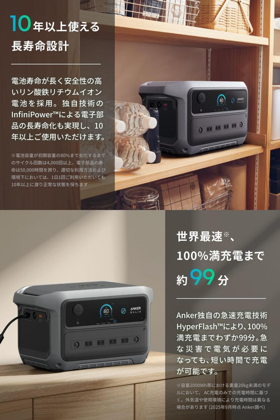 (※5:容量2,000Wh帯における重量20kg未満のモデルにおいて。 AC充電のみでの充電時間に基づく。外気温や使用環境により充電時間は異なる場合があります。(2025年9月時点 Anker調べ))