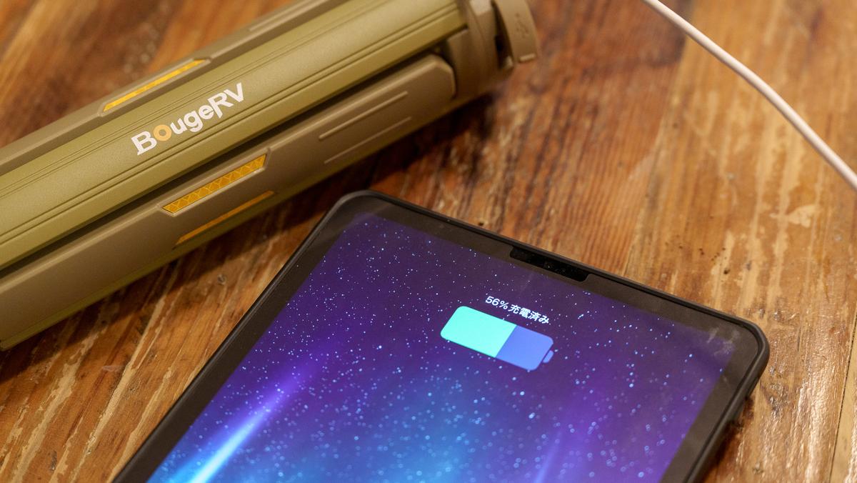 「CL04」は照明器具でありながら、スマホを充電できるモバイルバッテリーでもあります。15,600mAh大容量バッテリーを内蔵しており、USB-C出力は最大22.5Wと十分。