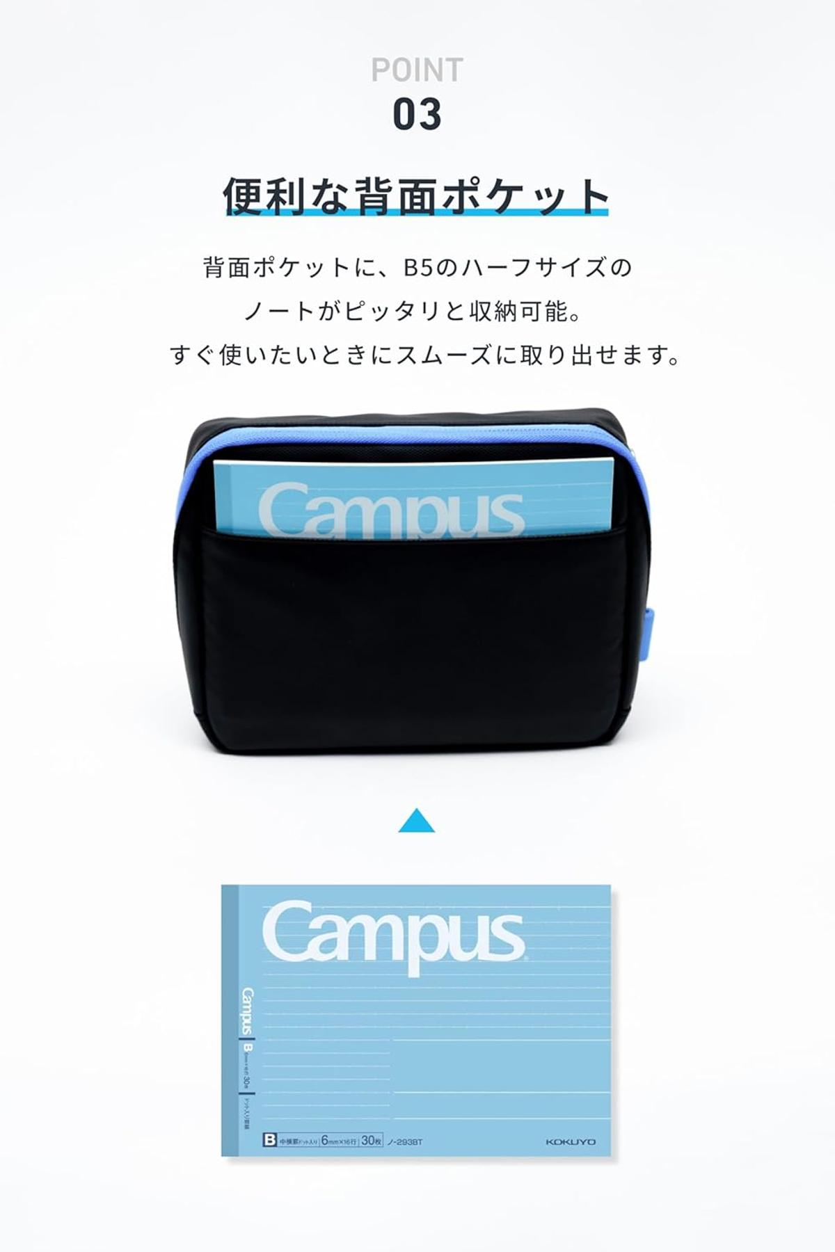 背面にはB5ハーフサイズのノートが収まるポケットを配置、ガジェットと手帳類を一体管理できます。